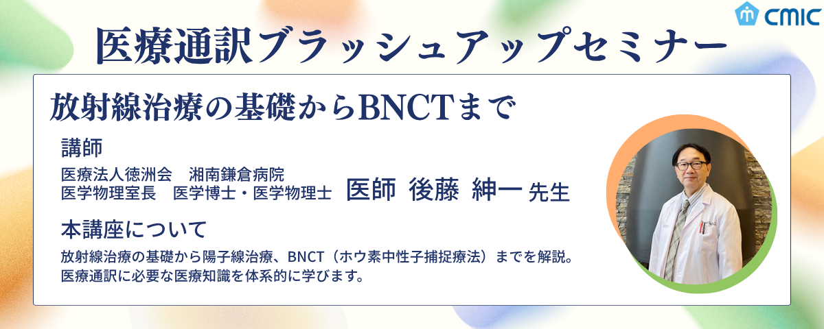 シミックソリューションズ株式会社が主催する「医療通訳ブラッシュアップセミナー」において、放射線治療・陽子線治療・BNCT(ホウ素中性子捕捉療法)をテーマとした新講座の配信を開始いたしました。